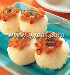 2.将白饭每50公克捏成圆形饭糰,两个一串,稍微压扁后放进烤箱微烤后取出,涂上作法1的味噌肉酱,再放入烤箱烤至微焦。