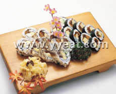 (2)将其余材料集中成条状放在海苔片近端上,利用竹帘将寿司捲起成长条,再平均切成8~9片即可。 休 闲居 编 辑