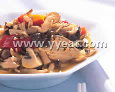 (3)锅内放入2大匙奶油,先爆香蒜末、姜末,再放入所有菇类及甜椒拌炒一下,再将所有调味料放入,用大火煮至汤汁微收干即可。