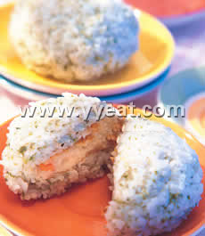 (3)手上先抹上少许盐,取1/2份海苔饭,略压出平面,将炸好的奶油可乐饼放在中间,上面再包上另外1/2份海苔饭,略压出平面,将炸好的奶油可乐饼放在中间,上面再包上另外1/2份海苔饭,再压紧成一个椭圆形饭糰。依序做好2份,即可放入盘中食用。