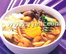 (3)将锅子烧热,放入1大匙油,先将高丽菜片、鸿禧菇、韭菜段放入炒过,再加入咖哩粉、虾仁一起炒香,加入高汤煮开后,将咖哩块放入,再加入酱油,拌匀后即为咖哩汤汁。