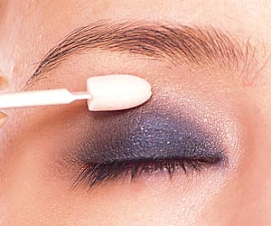 用眼影棒的另一端取适量深色眼影,以上眼睑二分之一的宽度晕染。