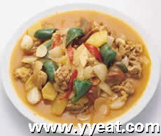 (3)将大蒜、辣椒及鸡肉爆香,再加入配料和洋葱拌炒。