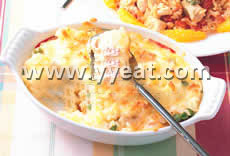 (4)把拌好的饭放在烤皿中,铺上马自拉起司,放进预热至180℃的烤箱中,烤约10分钟即可。