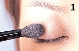 1.基础的底妆上好了之后,使用大眼影刷沾取米白色系的眼影,画于上眼皮闭眼时,眼球的突起处,整片大面积的刷上,尤其是眼球突起的正中央处,特别需要加强。