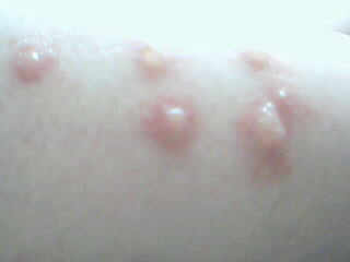 >>>>>>>>提问应该不是水豆吧..因为小时候得过水豆.但是现在的水泡越来越多了..本来只是脚腕和小腿.现在慢慢往大腿上蔓延...症状是皮肤表面发红.非常痒.用手铙后..慢慢的变大发肿发热.又痒又痛.然后过一晚上形成了水泡...天呐.我好害怕..真的成了皮肤病了么?高人救救我呀..