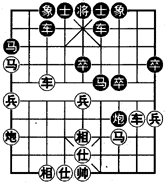[棋例]1975年10月2日国庆26周年北京游园表演赛,胡荣华对北京孙跃光,弈完第24回合的形势如图。双方以飞相局对左中炮布局演化而成。黑方利用兑车缓和局势。现在轮红方走棋,胡荣华巧妙运用隔岸观火之计,一举扩先取胜。实战着法如下。