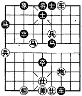 (棋例) 1984年全国象棋团体赛,辽宁尚威对云南河连生,弈至第33回合时的形势如图。双方以对兵局后转成列手炮布阵。双方子力均等,各有一兵卒过河,红方虽兵种齐全,但车炮被控。