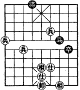 如图,是红三兵仕相全胜马卒的残局。红方先是用双兵联手,然后三兵合围取胜。着法红先: