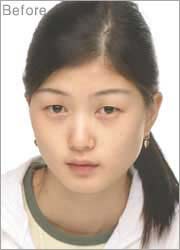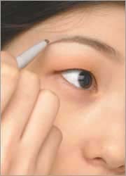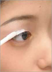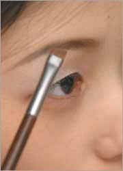 先充分涂抹保湿精华液,再用美白粉底来演绎白皙的皮肤。用自然米色湿粉均匀涂抹面部,再用自然色系的散粉增加洁净透明感。这款妆容中重要的环节是打造自然的肤色,所以一定要注意使皮肤显得滋润透明。