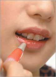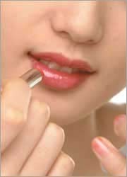 用橙色唇彩涂抹嘴唇内侧,再用含有橙色闪光粉轻轻涂抹嘴唇内侧,从而打造透明闪亮的美丽嘴唇。