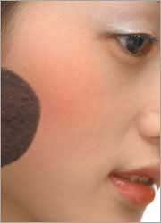 用橙色腮红在颧骨部位打着圆圈均匀涂刷,打造清新健康的自然美。