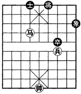 如图,红马兵对黑卒士象残局。红方兑兵后用马取象获胜,体现了马踩八方的威力。着法红先: