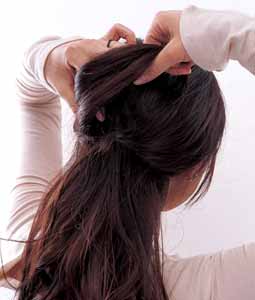 Step 3.头发较长的人,可以将马尾再扭转绕起用细发夹固定。