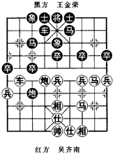 (局例1)如图,是1994年第八届全国城区邀请赛中,苏州吴齐南对苏州王金荣同室操戈,激 战到第20回合时的形势,由“过官炮对进马”布局演变而成。枰面上,双方大子相等,士相(象)齐全。红方车。马、炮盘踞河口要津;黑方多一卒,炮过河。现在轮到黑方走子,实战着法如下: