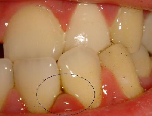 这个部位的牙龈乳头有炎症,可用消炎类药物.局部可涂抹碘甘油不过国外不一定有这种药物.剔牙时尽量别损伤牙龈.别的部位牙龈问题不太大.祝你好运!