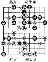 (局例)如图,是1982年第二届“五羊杯”冠军赛第三局,湖北柳大华对上海胡荣华激战到第18回合时出现的中局形势,由“中炮对反宫马”布局演变而成。枰面上,双方大子齐全。红方少双兵、残一相,炮镇中路,捉倒马,中兵过河,双车分占两肋,还有先行之利,形势一派大好;黑方车、炮分置左右两翼,双马暂无出路。现在轮到红方走子,实战着法如下: