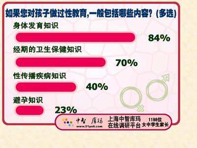 我们来看调查,如果您对孩子做过性教育,一般都包括哪些内容?因为这是多选题,所以我们接下来的这些选项,是根据家长的选择的多少来排列的。我们可以看到,身体发育知识,经期的,还有卫生保健知识,性传播疾病知识,避孕知识,是呈这样一个排列的。我们遗憾地看到,避孕知识只有23%的家长给孩子们做过,而专家说,这样的一个排列顺序,如果把它颠倒过来的话,是最实际,最有用的。
