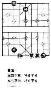 请看图及其着法。这是新旧规则都选用 的经典案例之一。红方步步照将,并且仅有的三个 棋子中只有车能走动,又无着可变,即使这样,也因它违反禁例,照样必须判负。
