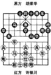 如图,是1998年捷安特杯赛,许银川对胡荣华弈完16回合的局面,轮到红方走。此时红贴身炮瞄住黑盘河马,只要平肋车顶马,逼其撤回,便可扩大先手。着法如下: