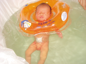 健康的新生儿天生不怕水,喜欢在水中寻找感觉,他们会把这当作在子宫内羊水中生活的继续,由于新生儿在自己熟悉的环境中,因此在水中一点也不害怕。